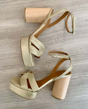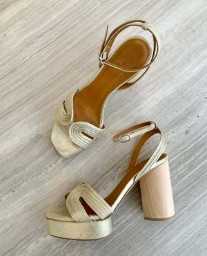 Our signature infinity arches are shaped by slim hand-sewn strips of leather resulting in the Amber Heel giving off some good vintage vibes. Fastening at the ankle, the Amber features generous coverage over the toes, a buckle closure, solid ash wood heel, and a leather covered recycled cork platform.FIT: The Amber Heel fits true to size. Please see our size guide to find your Coclico size. Spanish metallic brushed suede Heel: 90MM solid wood heel with a 25MM wrapped recycled cork platform Leather sole Made in Spain
