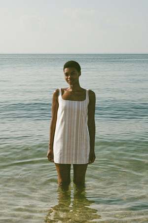 Made from soft, structured, textured cotton, this mini dress has a wide scoop neckline and a shift silhouette with pockets. It is fully lined and falls to mid-thigh. Age group: Adult.