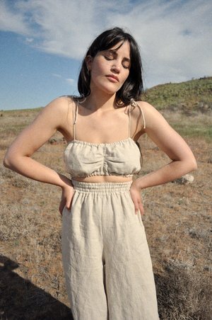 Cocobolo Bari top made from 100% linen in natural. Cropped bralette style with elastic detailing and tie shoulder straps. Our in house line is handmade in our studio in small quantities. Making these items takes time and effort. Please allow 4-8 weeks for production time if back ordered. Sizing chart: Xsmall Bust: 31.5-33 inches Waist: 23.5-25 inches Small Bust: 33.5-35 inches Waist: 25.5-27 inches Medium Bust: 35.5-37 Waist: 27.5-29 Large Bust: 37.5-40 Waist: 29.5-32 Handmade in Tacoma, WA.