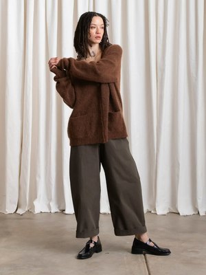 Oversized cardigan V-neck sweater in the softest Mohair yarn blend. 33% Mohair, 33% Wool, 28% Nylon, 6% Spandex MEASUREMENTS (laying flat): XS/S - Chest: 24.5, Length (Shoulder to hem): 28, Shoulder to Shoulder: 22" XS/S - Chest: 27, Length (Shoulder to hem): 29, Shoulder to Shoulder: 24"
