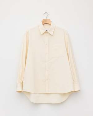 A standard fit button-up in ivory with an extended collar, single pleated cuff, and curved hem. Made in Bulgaria. Details - Single pleated cuff - Back box pleat - Curved hem - Corozo buttons Fabric 74% Cotton / 26% Linen HS code 6205.20.2010