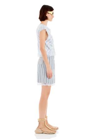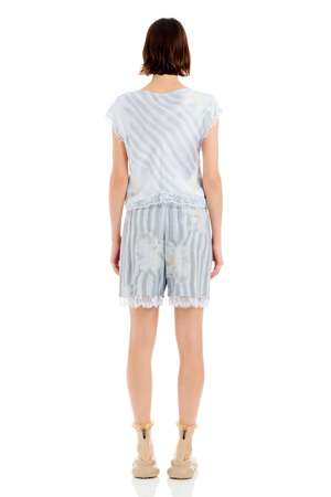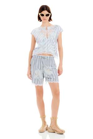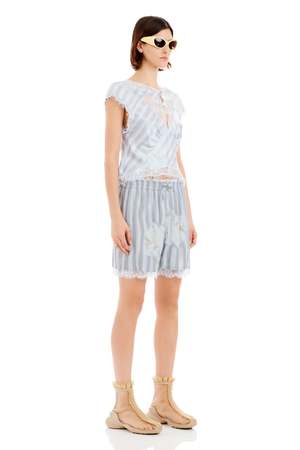 Elastic waist boxer shorts with a lace layer peeking through, featuring Collina Strada's custom Washed Wavy Navy Flower Stripe print and a custom recycled nylon lace. Fit: True to size. Model wears a Small and is 5'11". Composition: 100% Rose Sylk (fabric) / 49% Recycled Nylon, 51% Nylon (lace). Care: Hand wash in cold water, lay flat to dry. Made in USA.