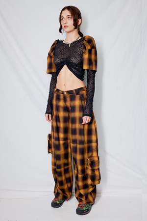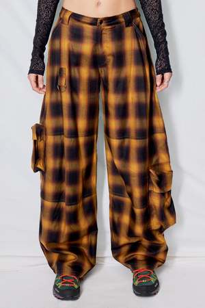 Brown Check Cotton Flannel Lawn Cargo Pant from Collina Strada. Relaxed fit with mid rise, wide leg cargo pant and large pockets all over. - 51% Organic Cotton / 49% Crupo - Made in NY
