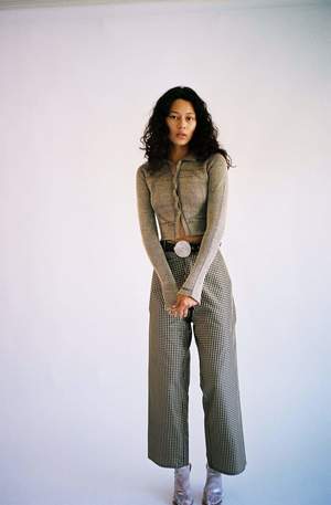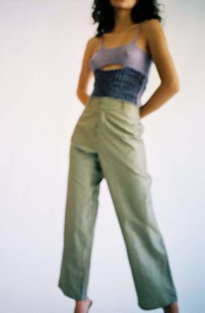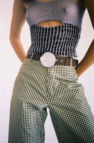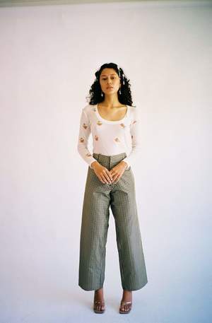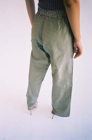Elevated workwear style pant. Black and yellow silk taffeta gingham. High or low rise depending on the wearer. Built-in elastic banding in the back for a more controlled fit. 2 Hook and eye closure for front middle zip, 2 front pockets, and 7 belt loops. Unisex sizing XS-L. Handmade in New York.