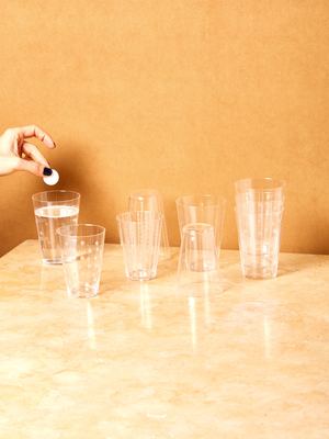 Simple glasses with elegant linear patterns of dots and lines. These fine elegant pieces come in 3 different patterns (2 of each pattern for a set of 6). Also available in simple yet detailed etched foliage glass. 4" H x 3" DIA, 8 oz