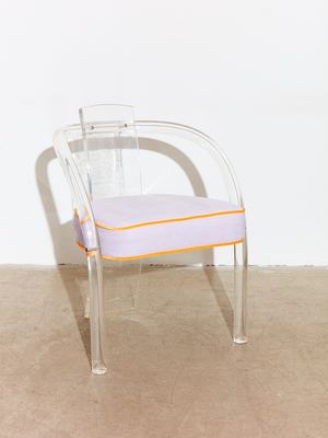 Single lucite chair by Wycombe-Meyer from 1975. Recovered in lavender ultra suede and neon orange piping. 29" H x 22" W x 22" D *Shipping rates do not accurately represent shipping costs for furniture. Contact shipping@comingsoonnewyork.com for details.*