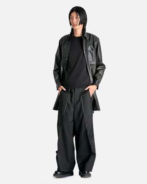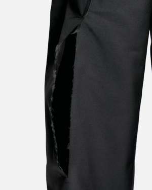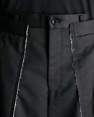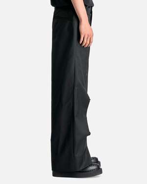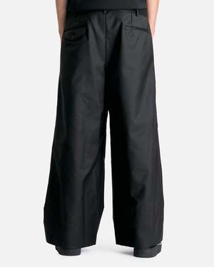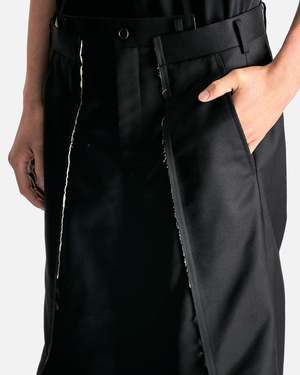 Comme des Garcons HOMME PLUS Spliced Wool Nylon Wide Leg Trousers in Black. These pants feature a zip fly and button closure, 4-pocket styling, asymmetric waistband, raw edge seams and slit opening at front seam. Product composition Main: 55% wool, 45% nylon, Lining: 100% cupro Made in Japan Model measurements Relaxed fit Model is 6'1\" with a 30\" waist and wears size medium Products features Belt loops Asymmetric waistband Zip fly and button closure Raw edge seams Slit opening front leg seams