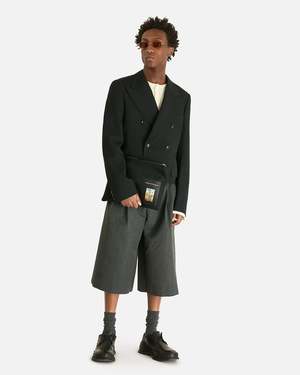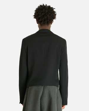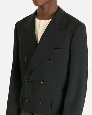 This double-breasted cropped jacket is crafted from wool gabardine and features notch lapels, a single chest pocket, and flap pockets on the front. Product SKU: PQ-J048-051-1 Model measurements and fit - Tailored fit, cropped - Model is 5'7" and wears size medium Product features - Notch lapels - Double-breasted design - Single chest pocket - Flap pocket on front - Surgeon's cuffs - Partially lined - Structured shoulders Composition and care - Main: 100% wool - Lining: 100% viscose - Made in Japan