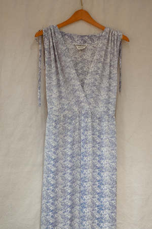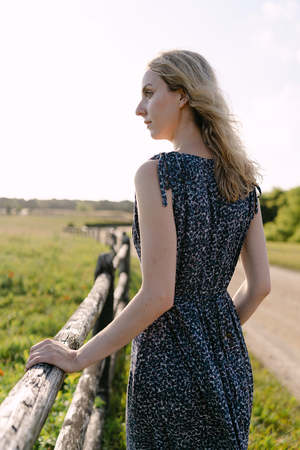 A V-neck style maxi dress with gathered drawstring detail at the shoulder. Features a flattering empire cut with a gathered skirt and pockets at both sides. This super breathable dress can be worn by itself during hot summer days or layered over jeans for a casual look.