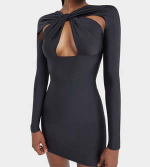 Stretch mini dress with twisted cut-out neckline that pulls together at the collarbone. Body sculpting with delicate ruching framing the dcolletage. Vendor Colour: Black Vendor Style: COPJS18545 Fabrication: 80% Polyamide, 20% Elastane. Made in Portugal. Cold handwash. Do not use bleach. Do not tumble dry. Iron Max 110. Perchloroethylene gentle max 13.