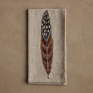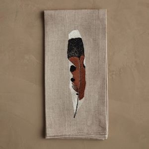 The Dinner Napkin by Coral & Tusk features embroidered feather designs inspired by found quills: Fowl Feather, Kestrel Feather, Owl Feather, and Red Tail Hawk Feather. Each napkin is crafted from linen and measures 20" 20" (folded: 5" 10").