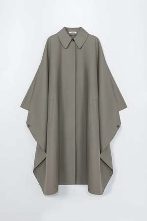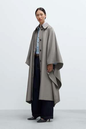 This piece combines the classic elements of the trench coat and cape. An oversized maxi-length cape with a spread collar and button closure running all the way down, with only the top button visible. It features front pockets and a flowing cape shape, secured with side buttons for a clean silhouette. Perfect for layering over any outfit. This coat is ethically and carefully manufactured in Galicia, Spain, and is made of high-quality fabric. The brand focuses on using the latest technology in the most sustainable ways: reducing water usage, plastic, and toxic waste. Made in Spain. One size. Size range runs from EU 34 to EU 42. Yuanyuan is 178 cm tall and is wearing One Size. 58% Cotton, 38% Polyamide, 4% Polyurethane. Water repellent. Do not wash. Do not bleach. Do not tumble dry. Dry flat. Iron on low heat. Dry clean only. Measurements (approximate): Bust: 144 cm / 57 in Bottom: 120 cm / 47 in Length: 126 cm / 50 in Sleeve: 71 cm / 28 in Bust: From armpit to armpit. Sleeve: From neck to cuff. Chest, waist, and hip measurements refer to contours. Please keep in mind that the measurements are approximate and there may be small variations in the knitted garments.