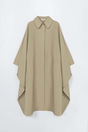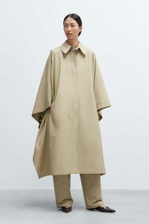 This piece combines the classic elements of a trench coat and a cape. It is an oversized, maxi-length cape with a spread collar and a button closure running all the way down, with only the top button visible. It features front pockets and a flowing cape shape, secured with side buttons for a clean silhouette. Perfect for layering over any outfit. Fit: ONE SIZE. Cordera's size range runs from EU size 34 to EU size 42. Model is 178 cm tall and is wearing One Size. Composition: 58% Cotton, 38% Polyamide, 4% Polyurethane. Water repellent. Care: Dry clean only. Do not wash, do not bleach, do not tumble dry. Dry flat. Iron on low heat. Made in Spain.