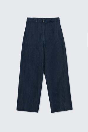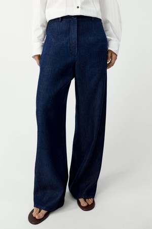 These straight-leg jeans feature an oversized fit with clean, modern lines. Designed with vertical side pockets and no back pockets for a sleek silhouette, they have an elasticated waistband at the back and belt loops for added comfort and versatility. Forward-shifted side seams add a subtle style detail that sets them apart. Made from soft, fluid denim, they offer great freedom of movement while retaining their structure. This pant is ethically and carefully made in Galicia, Spain from a high-quality fabric. With a focus on our planets future, the production uses the latest technologies and the most sustainable methods: reduced water and plastic consumption, and zero toxic waste. Made in Spain. Care: Machine wash cold. Do not bleach. Do not tumble dry. Iron at medium temperature. Dry clean allowed.