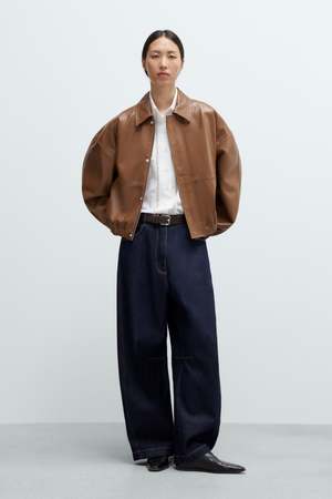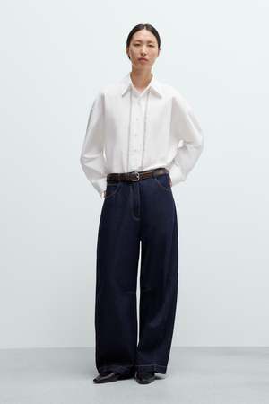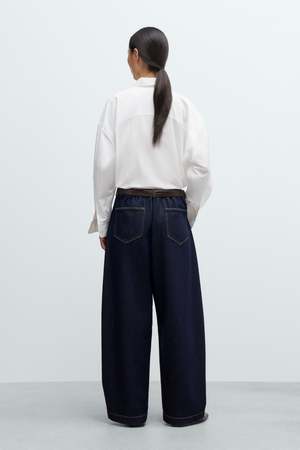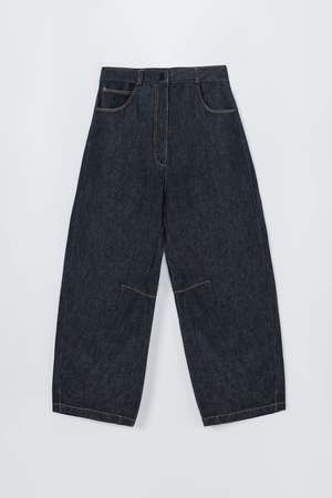 These curved baggy jeans feature a dark denim wash with contrasting stitching for a classic yet distinctive look. Designed with an oversized fit and low rise, they offer relaxed comfort and style. The traditional five-pocket design includes three front and two back pockets, complemented by belt loops for versatility. A unique internal knee seam adds subtle detail. Made from soft, substantial cotton fabric, these jeans provide ease of movement with a comfortable, non-rigid feel. Material: 100% Cotton. Oeko-Tex Standard 100. Made in Spain.
