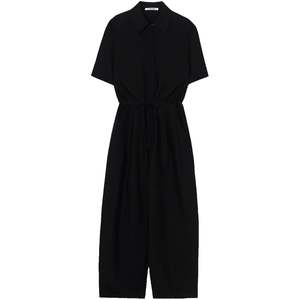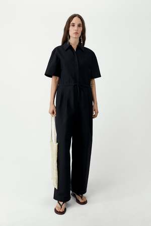 An oversized jumpsuit designed with an adjustable waist for a customizable fit, offering a relaxed yet refined silhouette. It fastens with a front zipper, while the upper part features a V-neckline with two buttons and the option to close it at the collar for a shirt-style finish. Short sleeves complete this versatile piece, blending ease and modern style. Made by Cordera in Spain. CONTENT & CARE: 89% Cotton, 11% Recycled Polyamide.