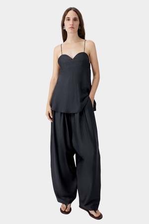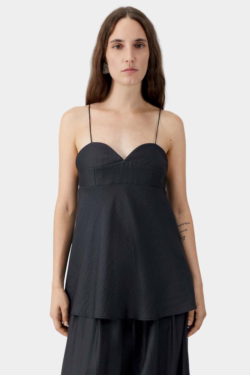 A softly feminine camisole designed with a low sweetheart neckline and delicate spaghetti straps. The bust is fitted with an elasticated back band that creates a comfortable shape before falling into a relaxed, fluid silhouette. Crafted from lightweight Lenzing lyocell, the fabric offers a smooth drape and breathable feel for warm weather styling. Type: Tank Top Care Hand wash cold Lay flat to dry Do not bleach Cool iron if needed Fit Fitted through bust Relaxed through body Adjustable feel with elastic back Details 80% lyocell, 20% polyamide Lenzing lyocell fabric Lightweight breathable fabric Sweetheart neckline Spaghetti straps Elasticated back band Relaxed flowing silhouette Made in Spain