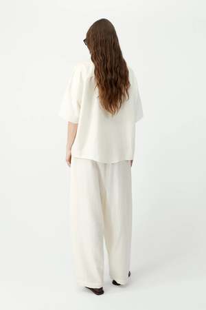 An oversized, cocoon-shaped shirt crafted from super-lightweight fabric for effortless comfort. The roomy short sleeves and relaxed silhouette create a modern, fluid fit, while a pointed collar adds a sharp touch. Small contrasting buttons run down the front, completing this easy, stylish piece that blends comfort and timeless appeal. - 80% Lyocell / 20% Polyamide - Made in Spain - One size, designed to fit approximately EU 3442.