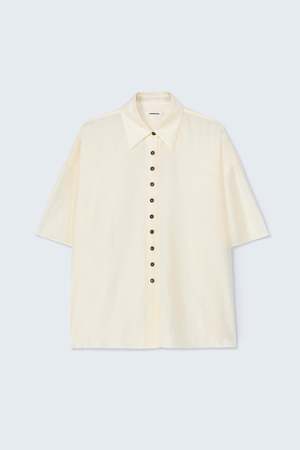 An oversized, cocoon-shaped shirt crafted in super-lightweight fabric for effortless comfort. The roomy short sleeves and relaxed silhouette create a modern, fluid fit, while a pointy collar adds a sharp touch. Small contrasting buttons run down the front, completing this easy, stylish piece that blends comfort and timeless appeal. - Marfil color - One size - 80% Lyocell, 20% Polyamide - Made in Spain - SKU #MCC6152