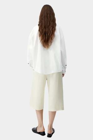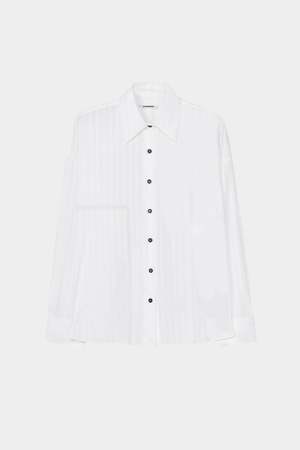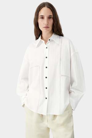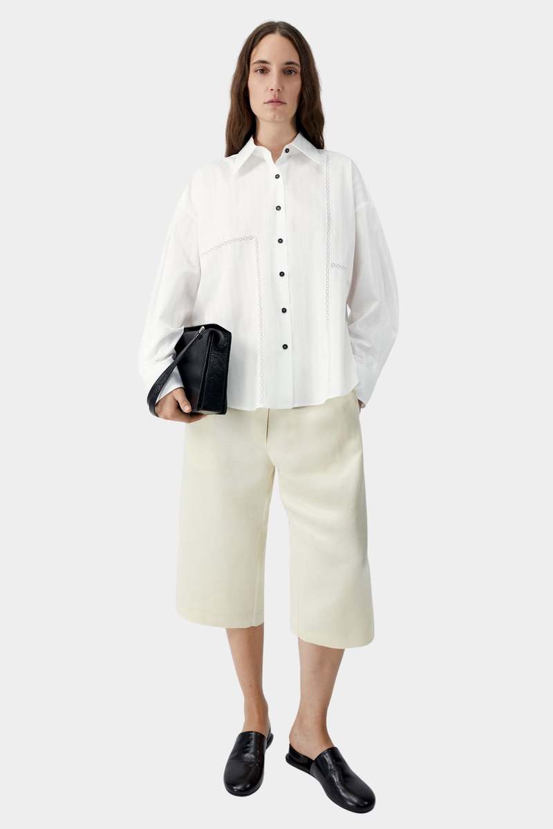 An oversized shirt designed with a relaxed, fluid silhouette and softly structured back that adds gentle volume. Crafted from lightweight white cotton lace with delicate pinstripe texture, the fabric offers breathability and subtle dimension. Finished with an Italian collar, front button closure, and contrasting black buttons, this piece blends playful charm with timeless tailoring. Care Machine wash cold Wash with similar colors Do not bleach Iron on low if needed Fit Oversized fit Relaxed through body and shoulders Designed for an easy drape Details 100% cotton Lightweight lace cotton fabric Subtle pinstripe texture Button front closure Italian collar Contrasting black buttons Softly structured back Oversized relaxed silhouette OEKO-TEX Standard 100 certified fabric Made in Spain