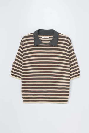 This striped polo is crafted from lightweight organic cotton, offering a soft feel and breathable comfort. Designed in a regular fit, it features an open polo collar with no buttons for a relaxed, effortless look. The playful stripes in grey, terracotta, and vanilla bring a fresh and charming touch. Finished with ribbed cuffs and hem for subtle structure an easy favorite for warm days. ONE SIZE. Size range runs as 34 EU size to 42 EU size. - 100% LS Organic Cotton. GOTS / Organic Content Standard (OCS) - Dry clean only - Made in Spain This polo is ethically and carefully manufactured in La Corua, with Japanese knitting machines and finished by hand. The brand uses recycled yarns with traceability certified and a low environmental impact production cycle.