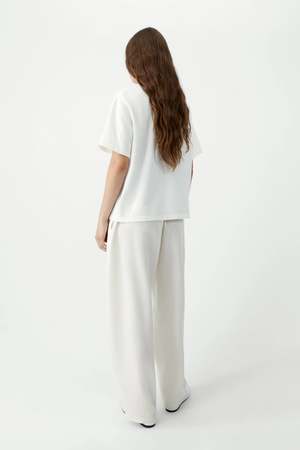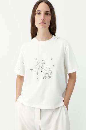 A classic T-shirt elevated with subtle front embroidery featuring two charming lamb motifs and delicate sleeve finishes. An emblematic style that reflects the brands identity and timeless aesthetic, crafted in a bright white shade for easy, everyday wear. This T-shirt is ethically and carefully made in Galicia, Spain, from a high-quality fabric. With a focus on the future of our planet, the production uses the latest technologies and prioritizes the most sustainable methods: reduced water and plastic consumption, and zero toxic waste. Made in Spain.