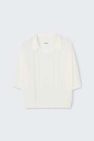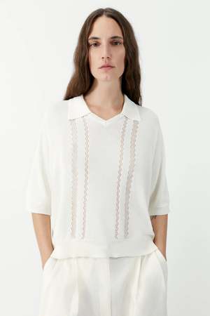A super-light short-sleeve polo with a relaxed regular fit. Designed with a V-neckline and classic polo collar, it features delicate openwork detailing on the front in two vertical bands. Finished with a ribbed hem at the waist, this piece blends airy elegance with timeless ease. 83% Viscose, 17% Nylon Made in Spain. ONE SIZE. Mindfully designed to fit a size range of EU 34 to EU 42.