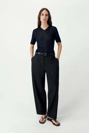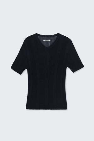 A finely ribbed knit t-shirt in a super-light fabric with natural stretch for a comfortable fit. Cut in a regular silhouette, it features short sleeves and a refined V-neckline finished with delicate wave detailing. An airy, versatile piece that combines subtle texture with timeless ease. - 100% Viscose - Made in Spain - One size, mindfully designed to fit a size range of EU 34 to EU 42