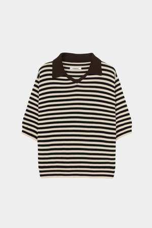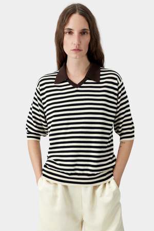 A super-light short-sleeve polo crafted from long-staple organic cotton with a relaxed regular fit. The design features a V neckline with a classic polo collar in contrasting brown, while subtle ecru and black stripe detailing adds a refined graphic touch. Finished with a ribbed hem at the waist, this knit balances airy structure with timeless ease. Care Hand wash cold Lay flat to dry Do not bleach Cool iron if needed Fit Relaxed regular fit Straight silhouette through body Fits true to size Details 100% long staple organic cotton Lightweight breathable cotton knit V neckline with polo collar Contrast brown collar detail Ecru and black stripe accents Short sleeves Ribbed hem at waist Relaxed regular fit GOTS certified organic cotton Organic Content Standard (OCS) certified Made in Spain