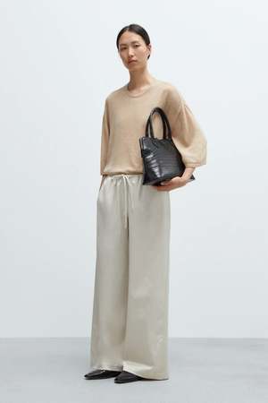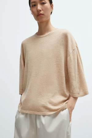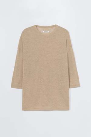 This oversized T-shirt is crafted from extrafine merino wool. It features a relaxed silhouette with dropped shoulders and 3/4 sleeves, finished with a classic crewneck. Light and effortlessly comfortable, it's perfect for everyday wear. This T-shirt is ethically and carefully manufactured in La Corua, with Japanese knitting machines and finished by hand. The brand uses recycled yarns with certified traceability and a low environmental impact production cycle. Made in Spain. ONE SIZE. Size range runs from EU size 34 to EU size 42. Yuanyuan is 178 cm tall and is wearing One Size. 100% extrafine merino wool. Do not wash. Do not bleach. Do not tumble dry. Dry flat. Iron on low heat. Dry clean only. Size guide (garment measurements): Shoulder: 58 cm / 23 in Bust: 58 cm / 23 in Bottom/Waist: 58 cm / 23 in Length: 64 cm / 25 in Sleeve: 52 cm / 20 in Shoulder: From armhole to armhole. Bust: From armpit to armpit. Sleeve: From neck to cuff. Chest, waist and hip measurements refer to contours. Please keep in mind that the measurements are approximate and there may be small variations in knitted garments.
