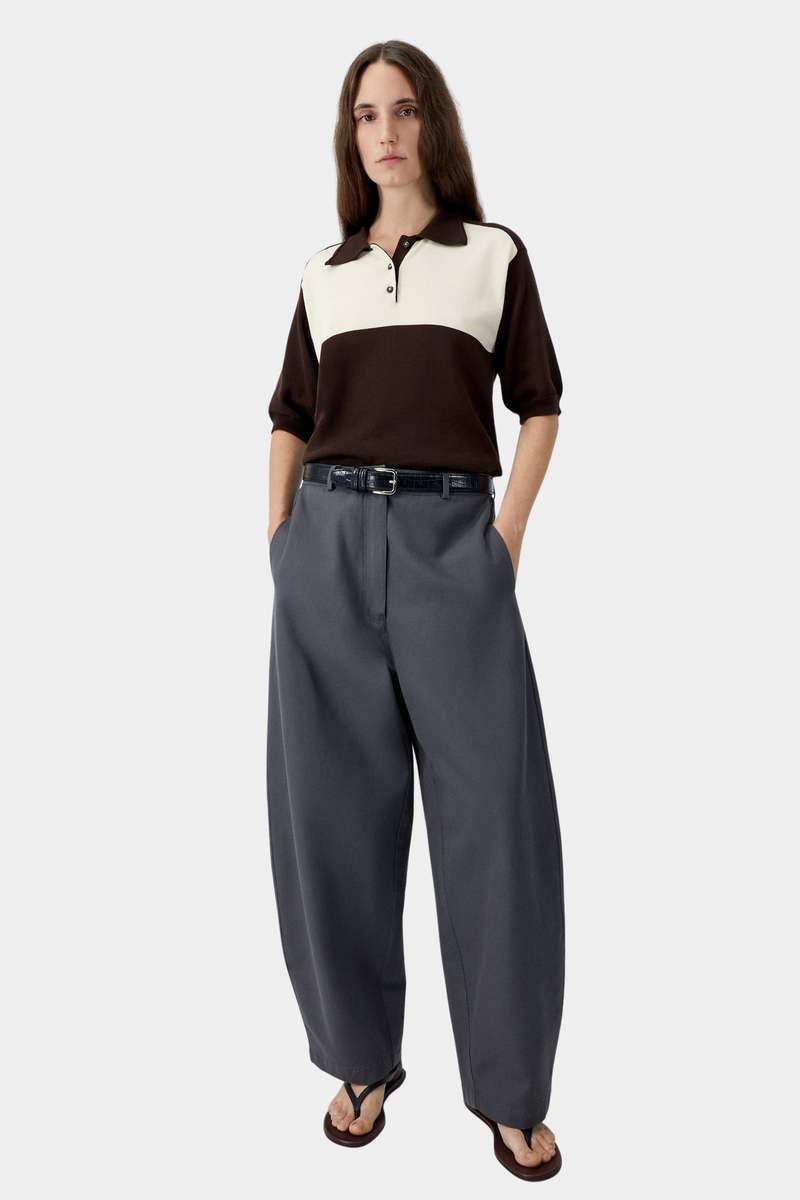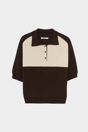 A refined polo knit crafted from soft long-staple organic cotton with a relaxed, slightly oversized fit. The design features a textured polo collar and classic three-button placket, highlighted by a color-blocked front panel in brown and vanilla. The back remains clean in solid brown and is finished with subtle openwork knit detailing. Care Hand wash cold Lay flat to dry Do not bleach Cool iron if needed Fit Slightly oversized regular fit Straight silhouette through body Fits true to size Details 100% long staple organic cotton Soft breathable cotton knit Textured polo collar Three button placket Colorblock front panel Subtle openwork knit detailing at back Short sleeves Slightly oversized regular fit GOTS certified organic cotton Organic Content Standard (OCS) certified Made in Spain