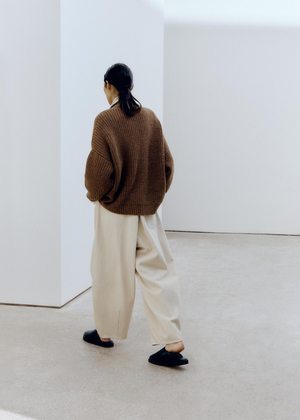 Designed to feel it loosely on the body, the boxy shape gives it a slightly boyfriend fit. Chunky and soft structure, detailed with front pockets and button fastening, will be the perfect one to use every day. This cardigan is ethically and carefully manufactured in La Corua, with Japanese knitting machines and finished by hand. This garment isn't dyed, colors are created from the mixing of the alpaca and the wool natural colors. We care about animals so these yarns are cruelty-free certificated and obtained only from mulesing-free and ethical breeding. Sizing + Details - 50% Virgin Eco Wool, 50% Superfine Eco Alpaca - O/S Size Range Runs 36 EU Size To 42 EU Size - Charlotte Stands 5' 7" And Wears O/S