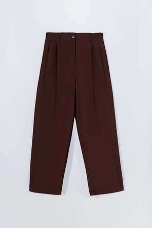 An elevated update to the iconic Tailored Masculine Pants, now featuring a higher waist and refined proportions for an even more flattering silhouette. Crafted from high-quality fabric with a timeless burgundy tone, they maintain their signature loose, masculine fit with a mid-rise and double front pleats for added structure. Details include jetted side pockets, back welt pockets, an elasticated waistband at the back, zip and button closure, and belt loops. A year-round essential designed for effortless, modern dressing. Made in Spain. ONE SIZE. Size range runs from 34 EU to 42 EU. Yuanyuan is 178 cm tall and is wearing One Size. 54% Virgin Wool, 45% Polyester, 1% Elastane. Do not wash. Do not bleach. Do not tumble dry. Dry flat. Iron on low heat. Dry clean only.