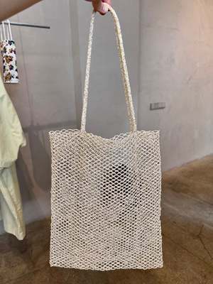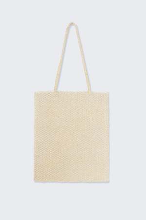 This piece is the result of a collaboration between Cordera and a women's community in Central America. A handmade refined tote bag that creates a beaded fishing net with two long straps. A comfortable and spacious bag for everyday. - Cream - 100% Acrylic beads - Made in Spain - SKU #MCC6553