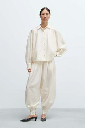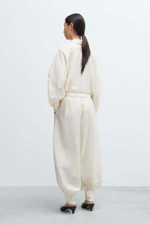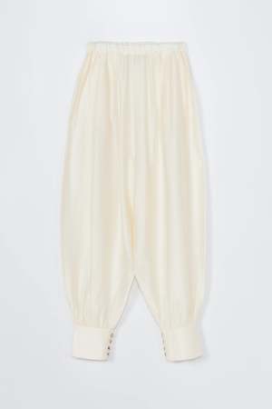 These sarouel trousers are crafted from an ultra-fluid, semi-sheer fabric that drapes beautifully with a soft balloon shape. Designed with a low rise and a fully elasticated waistband for effortless comfort, they feature side pockets and cuffed ankles with four small buttons. The relaxed silhouette tapers gently at the ankle, enhancing the unique volume. Wear them on their own or as a set with the matching Balloon Shirt Marfil for a sophisticated yet easy look. These pants are ethically and carefully manufactured in Galicia, Spain, using high-quality fabric. Cordera focuses on more sustainable production methods, including reduced water usage, less plastic, and no toxic waste. Made in Spain. Size ZERO: fits approximately EU 3238 Size ONE: fits approximately EU 3642 Yuanyuan is 178 cm tall and is wearing Size One. Composition 80% Lyocell, 20% Polyamide (LENZING Lyocell). Care Do not wash. Do not bleach. Do not tumble dry. Iron on low heat. Dry clean. Size Guide (Garment Measurements) Measurement Size 0 (cm / inches) - Waist: 34 / 13 - Length: 102 / 40 - Hips: 61 / 24 - Rise: 44 / 17 - Inseam: 64 / 25 Measurement Size 1 (cm / inches) - Waist: 36 / 14 - Length: 106 / 42 - Hips: 63 / 25 - Rise: 45 / 18 - Inseam: 65 / 26 Chest, waist and hip measurements refer to contours. Please keep in mind that the measurements are approximate and there may be small variations in the knitted garments.