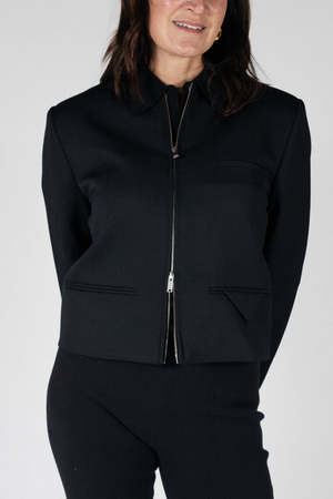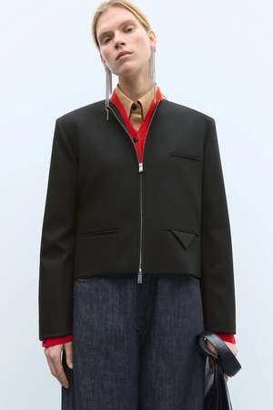 A modern take on timeless tailoring. This piece features a flattering cropped fit with a round neckline and a sleek double-sided zip closure. Detailed with buttons on the cuffs and three front pockets. Perfect for creating effortlessly polished looks, this jacket blends sophistication with contemporary flair. Made in Spain. 55% Polyester | 43% Virgin Wool | 2% Elastane. ONE SIZE. Size range runs as 34 EU size to 42 EU size. Model is 5'8" tall and is wearing One Size.