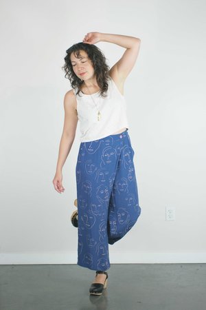 We LURVE these pants! A dressy enough pant for attending a wedding, work, or just running around with friends. These feature a crossover panel in front with button closure, elastic waist in back, and two side seam pockets. Chika is 56 and wears her usual medium. Cat (short hair) is 53 and wears her usual XS. Fabric Contents: 100% Viscose Care Instructions: Hand wash cold, hang to dry. Or Dry Clean. Made in the USA.