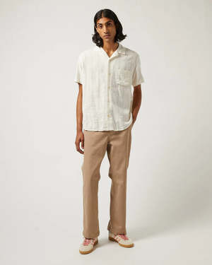 - 60% Cotton 40% Viscose - Insanely soft blend - Camp collar - Corozo Buttons This piece was produced in Madras, India, in a workshop that has dedicated 3 decades to high quality fabrics, crafted in working conditions of the utmost dignity. Melding the new (Japanese sewing machines) with the old (hand embroidery, hand loomed fabrics, natural dying) results in a product both timeless and contemporary. The workshop partners with a rehabilitation center for women encountering domestic violence, and provides for its artisans an open air workshop, on-site day care, garden, and living wages.