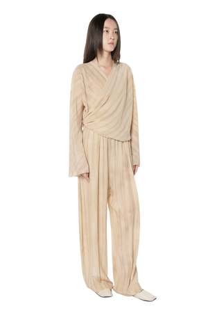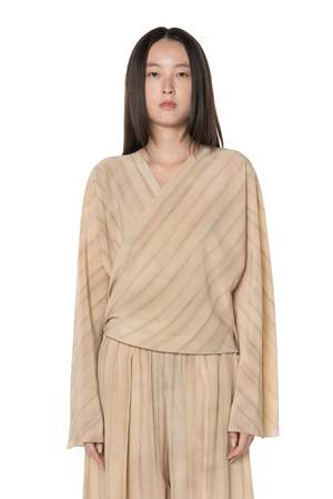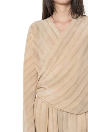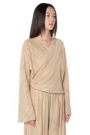 The Fedra Print Shirt by Cortana is a wrap blouse with a V-neckline made of silk with an irregular striped print. The top ties in the back with two stripes of the same fabric. This exclusive print is based on a watercolour painting by Cortana's creative director. Perfect to wear with the matching Fedra pants. Colour: Ivory. Composition: Silk. Made in Spain.