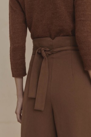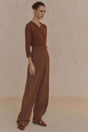 High-waisted wrap pants that cross over at the front with an integrated sash and tie at the waist. Colour: Brown. Composition: 100% linen. Made in Italy.