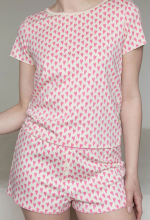 Cuddle up in our sweetest print yet, Love Floats! Made from cloud soft 100% printed pima cotton, the Suzie PJ is full of love. The lightweight Baby Jean Tee and Tate Short are essential for when you crave something soft on your skin. The top has adorable picot embroidery on the neck and matching pop color stitching. The short has a pop color super soft waistband, imitation corozo buttons that have a contrast color rim, and a back pocket. Type: Lounge + Sleepwear