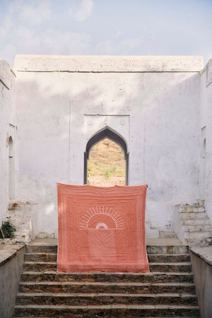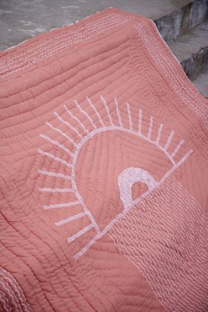 Each quilt is handmade, requiring attention from 4 different artisans, including wood carvers, block printers, quiltmakers, and dye specialists. The design is hand-pressed onto each quilt using hand-carved wooden blocks dipped in dyes. The printed cotton shells are brought to the homes of quiltmakers, who stuff and stitch the quilts by hand, creating the final product. Our quilts are made in small batches. Due to the handcrafted nature of this item, expect slight variations in the appearance of each unique piece. - 100% cotton voile exterior - 100% cotton stuffing - Made in India - Queen size: 96 x 96 - King size: 108 x 108