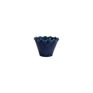 Small round stoneware planter with a ruffled edge and drainage hole. Dimensions: 5.5" round x 4" high. Holds a 3" pot. Features a reactive glaze finish in blue. Each piece will vary slightly in appearance.