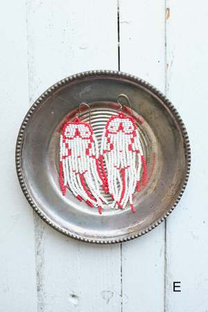 Jaquelyn Stewart is a Cree and Mohawk beadwork artist based in Keremeos, BC. Her intricate designs bring colour and beauty to any outfit. Details: - Seed bead earrings with surgical steel shepherds hooks - Handmade in Canada *Please indicate which design you would like in order notes A - Autumn Fringe B - Sage Fringe C - Pride Fringe D - Turquoise and Red Fringe E - Body Fringe