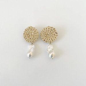 Circular earrings with hand woven palm detailing and baroque pearl Made in collaboration with norma lilia cruz santiago in oaxaca, mexico Made in california and oaxaca Material: brass / silver posts, woven palm, pearl