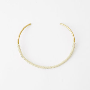 A simplistic, hand tooled choker with intricately hand woven palm detailing. Made in collaboration with norma lilia cruz santiago in oaxaca, mexico Made in california and oaxaca Material: brass and woven palm Will patina with age Dimensions: 4.5 tall x 5 wide