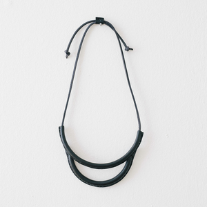 a sculptural necklace with hand stitched leather detailing and an adjustable closure. made in california material: leather dimensions: 4 tall x 5.5 wide leather cord: 30 available in: natural, black, saddle brown and white
