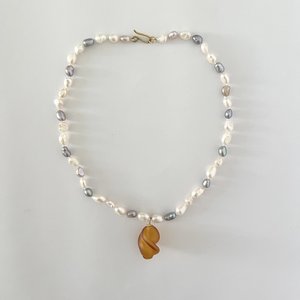 a small, matte amber glass pendant on a grey, pink and white iridescent pearl choker. featuring handmade hook and eye closure made in California and Murano, Italy material: pearl, glass, brass free shipping on all domestic orders length: 15.5 inches