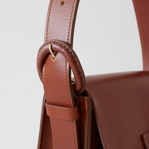 a structured purse in a saddle brown latigo leather. features wide shoulder strap with leather wrapped buckle detail and inner pocket. made in california material: leather with brass hardware dimensions: 6" tall x 8" wide x 2" deep