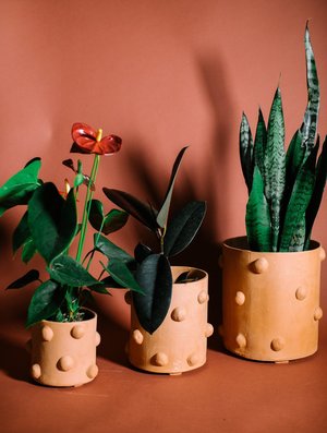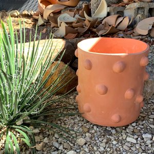 Slab-built planters with an unglazed raw clay exterior. Available in Small, Medium, Large; these have a drainage hole for excess water to escape from. These pieces are handcrafted, so slight variations and surface textures are embraced and celebrated. Also available in White & Black. Small: ~5" diameter x 5 tall Medium: ~7 diameter x 8 tall Large: ~8" diameter x 10" tall - Handmade in Minneapolis, Minnesota - Unglazed ceramic with drainage hole